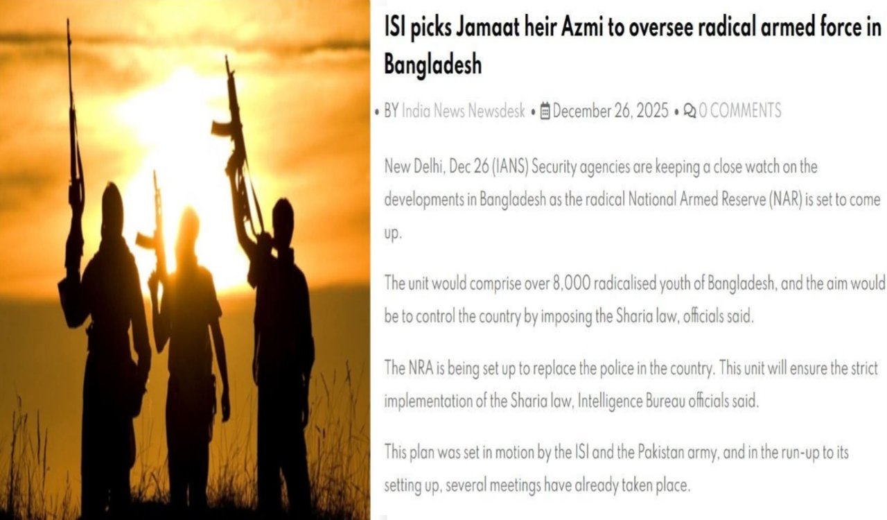 নয়াদিল্লি, ২৬ ডিসেম্বর (আইএএনএস): বাংলাদেশে সম্ভাব্য কিছু নতুন ঘটনার দিকে কড়া নজর রাখছে নিরাপত্তা সংস্থাগুলো, কারণ কট্টরপন্থী ন্যাশনাল আর্মড রিজার্ভ (এনএআর) গঠনের উদ্যোগ নেওয়া হয়েছে।