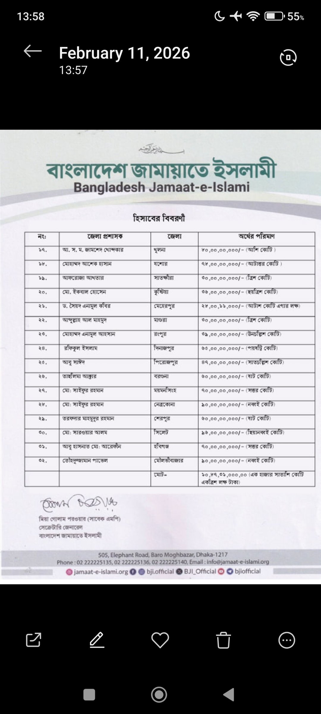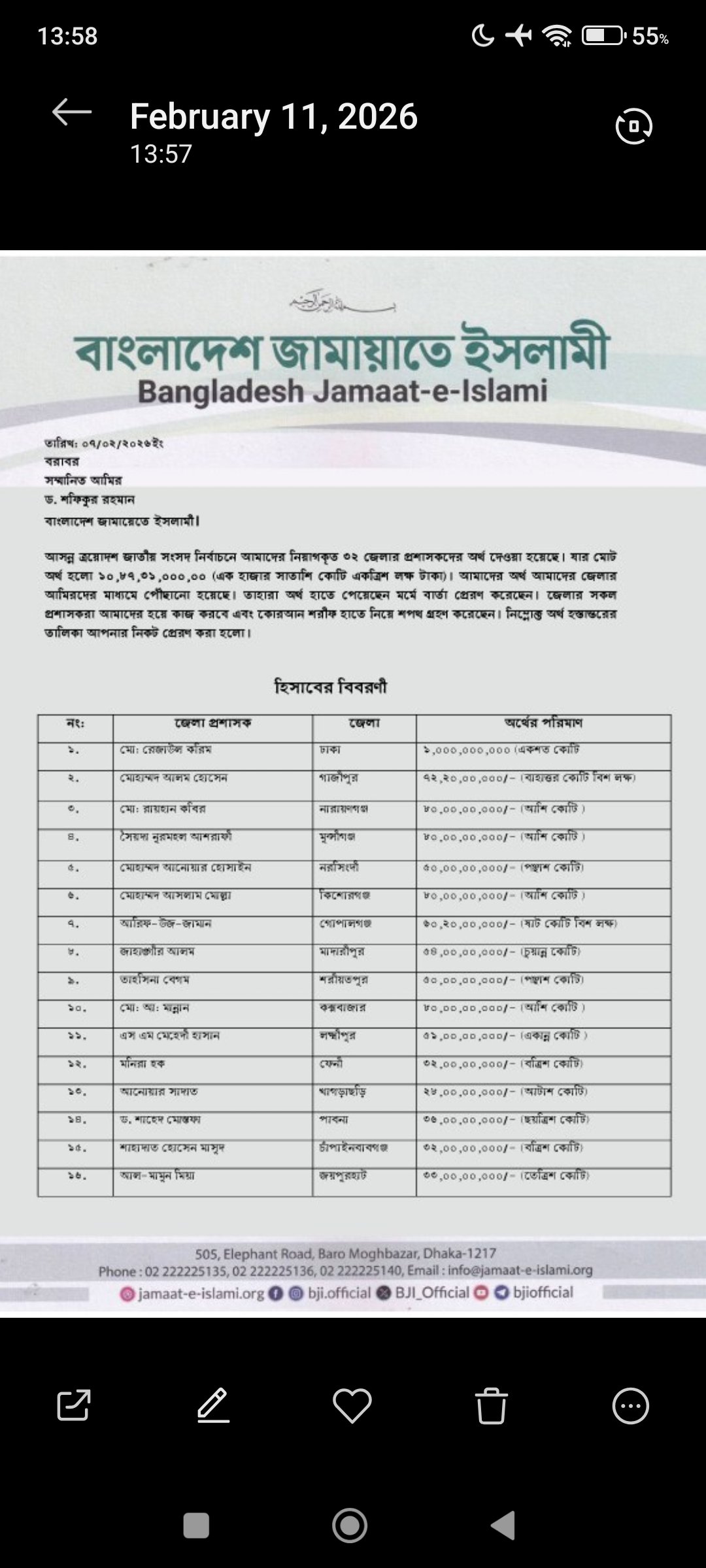 নথিতে আর্থিক লেনদেনের এক বিশাল অংকের হিসাব, নির্বাচিত জেলা প্রশাসকদের অনুকূলে মোট ১,০৮৭ কোটি ৩১ লক্ষ টাকা বরাদ্দ করা হয়েছে। এই অর্থ সরাসরি জামায়াতের সংশ্লিষ্ট জেলা আমিরদের মাধ্যমে ওইসব প্রশাসকদের নিকট পৌঁছানো হয়েছে। প্রশাসকরা উক্ত অর্থ বুঝে পেয়েছেন মর্মে পাল্টা গোপন বার্তা বা কনফার্মেশন পাঠিয়েছেন।
