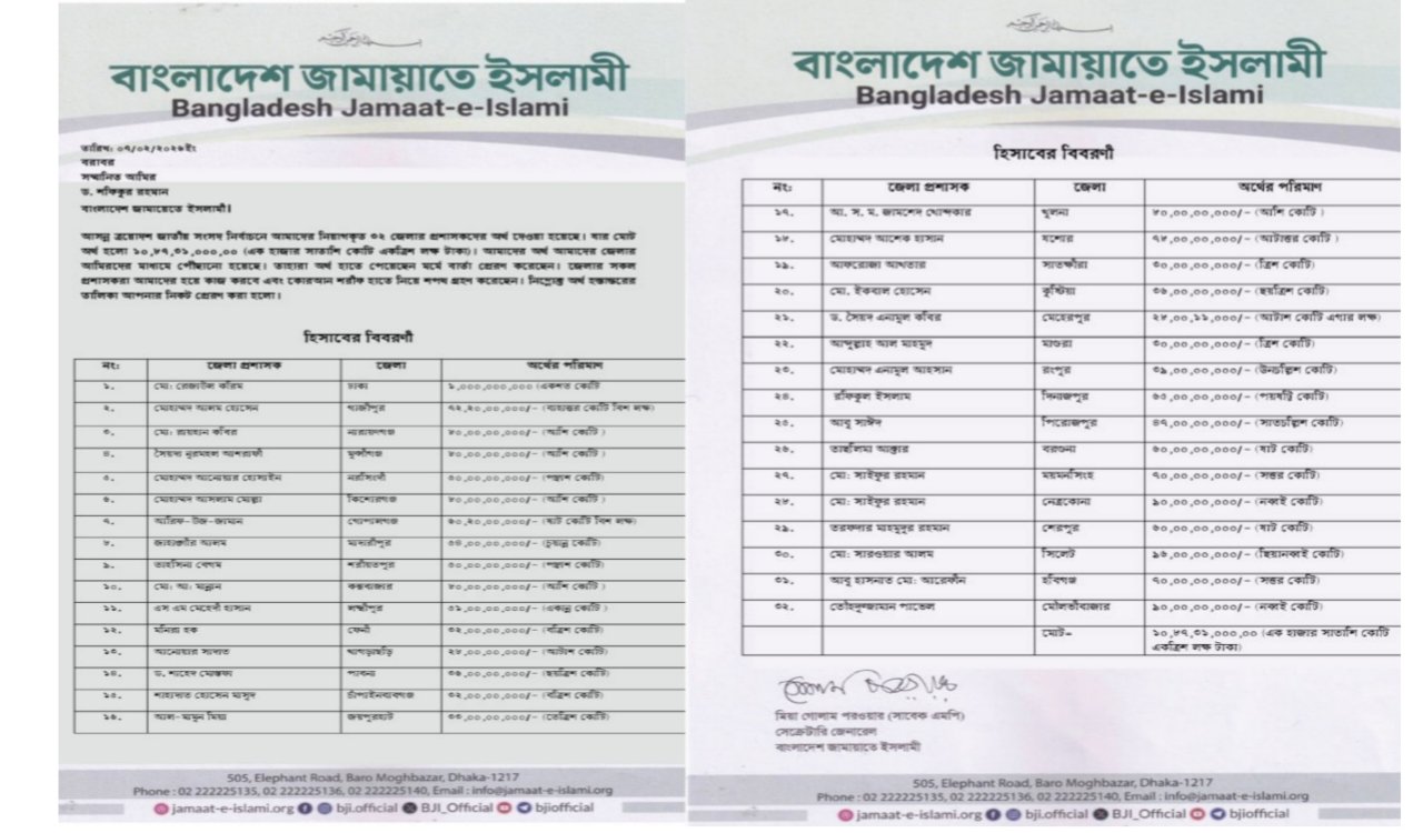 নথিতে আর্থিক লেনদেনের এক বিশাল অংকের হিসাব, নির্বাচিত জেলা প্রশাসকদের অনুকূলে মোট ১,০৮৭ কোটি ৩১ লক্ষ টাকা বরাদ্দ করা হয়েছে। এই অর্থ সরাসরি জামায়াতের সংশ্লিষ্ট জেলা আমিরদের মাধ্যমে ওইসব প্রশাসকদের নিকট পৌঁছানো হয়েছে। প্রশাসকরা উক্ত অর্থ বুঝে পেয়েছেন মর্মে পাল্টা গোপন বার্তা বা কনফার্মেশন পাঠিয়েছেন।