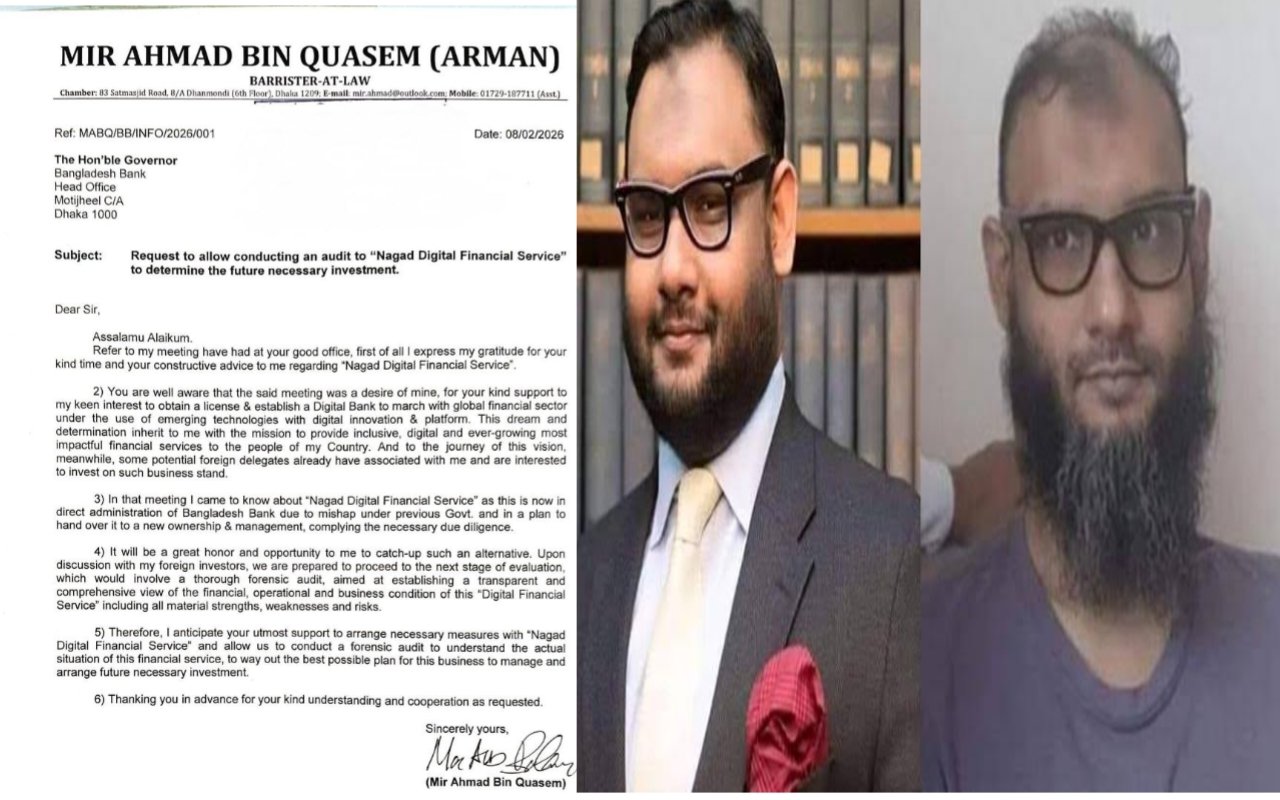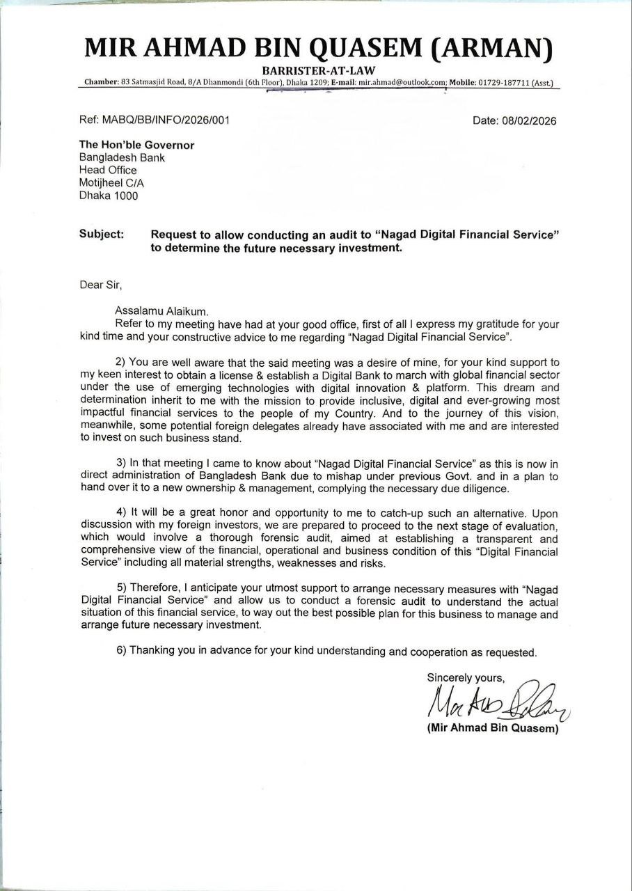 জানা গেছে, গত ৮ ফেব্রুয়ারি বাংলাদেশ ব্যাংকের গভর্নর বরাবর একটি চিঠি দেন ব্যারিস্টার আরমান। চিঠির বিষয়বস্তু ছিল—ভবিষ্যৎ বিনিয়োগ নির্ধারণের জন্য ‘নগদ ডিজিটাল ফিন্যান্সিয়াল সার্ভিস’-এ অডিট বা নিরীক্ষা পরিচালনার অনুমতি প্রদান।