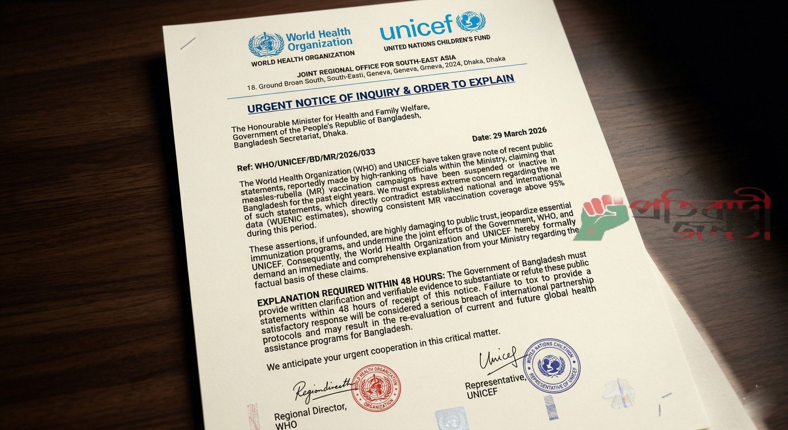 দেশের স্বাস্থ্য খাতের ইতিহাসে নজিরবিহীন এক কূটনৈতিক ও প্রশাসনিক কেলেঙ্কারি ফাঁস হয়ে গেছে। “বিগত ৮ বছর দেশে হামের টিকা দেওয়া হয়নি”—স্বাস্থ্যমন্ত্রীর এমন বিতর্কিত ও তথ্যহীন বক্তব্যের জেরে গত ২ দিন আগে কঠোর ‘কারণ দর্শানোর নোটিশ’ ও ‘জরুরি তলব’ পাঠিয়েছে বিশ্ব স্বাস্থ্য সংস্থা (WHO) এবং ইউনিসেফ (UNICEF)। অত্যন্ত স্পর্শকাতর এই আন্তর্জাতিক নোটিশটি বর্তমান সরকার জনসমক্ষে গোপন রাখলেও জাতীয় নিরাপত্তা গোয়েন্দা সংস্থা (NSI) সেই তথ্যের জাল ছিঁড়ে সত্য প্রকাশ করে দিয়েছে।